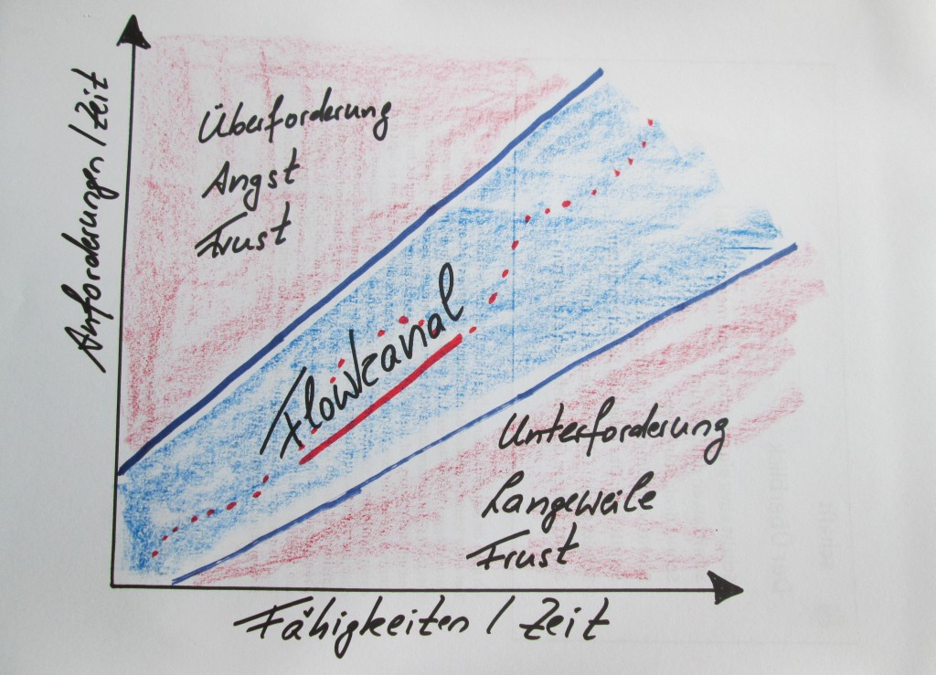 Flow wird dort als ein schmaler Kanal zwischen Langeweile und Angst definiert. Nach meiner Erfahrung lässt sich das Bild des Flowkanals nicht nur auf Ansprüche zwischen Langeweile und Angst anwenden, sondern auch auf Anforderungen zwischen Hektik und Trägheit, zwischen Burn out und Bore out, zwischen dem Gefühl der Überforderung, nicht wegen zu hoher inhaltlicher Anforderungen sondern weil es einfach zu viel ist und zu wenig Anforderung für das vorhandene Zeitpensum.